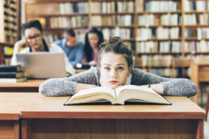 Tired student studying for exam at library